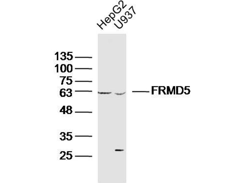 Background: FERM domains are roughly 150 amino acids in length and are found in a number of cytoskeletal-associated proteins such as Ezrin, Radixin, Moesin and 4.1 (erythrocyte membrane protein band 4.1), where they provide a link between cytoskeletal signals and membrane dynamics. FRMD5 (FERM domain-containing protein 5) is a 570 amino acid single-pass membrane protein that contains one FERM domain and exists as two alternatively spliced isoforms. The gene encoding FRMD5 maps to human chromosome 15, which houses over 700 genes and comprises nearly 3 % of the human genome. Angelman syndrome, Prader-Willi syndrome, Tay-Sachs disease and Marfan syndrome are all associated with defects in chromosome 15-localized genes.