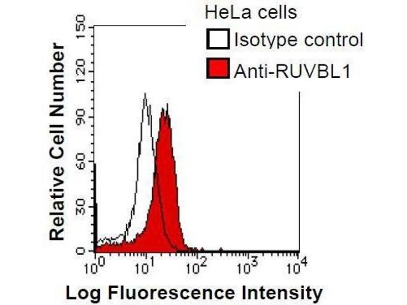 - This gene possesses single-stranded DNA-stimulated ATPase and ATP-dependent DNA helicase (3' to 5') activity. Component of the NuA4 histone acetyltransferase complex which is involved in transcriptional activation of select genes principally by acetylation of nucleosomal histone H4 and H2A. This modification may both alter nucleosome - DNA interactions and promote interaction of the modified histones with other proteins which positively regulate transcription. This complex may be required for the activation of transcriptional programs associated with oncogene and proto-oncogene mediated growth induction, tumor suppressor mediated growth arrest and replicative senescence, apoptosis, and DNA repair. Synonyms: Monoclonal RUVBL1 antibody, Anti-RUVBL1 antibody, RuvB (E coli homolog)-like 1 antibody, RVB1 antibody, ECP54 antibody, TIP49 antibody, NMP238 antibody, TIP49A antibody.