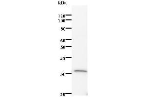 IFI35 antibody in PBS (3.0 mM KCl, 1.5 mM KH2 PO4 , 140 mM NaCl, 8.0 mM Na2 HPO4 (pH 7.4)) containing 1 % bovine serum albumin (BSA) and 0.05 % sodium azide (NaN3 ).