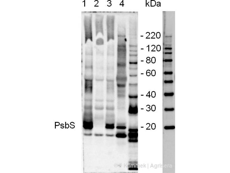 - KLH-conjugated synthetic peptide derived from available di and monocot PsbS sequences, including Arabidopsis thaliana (At1g44575). This sequence is even conserved in conifers.