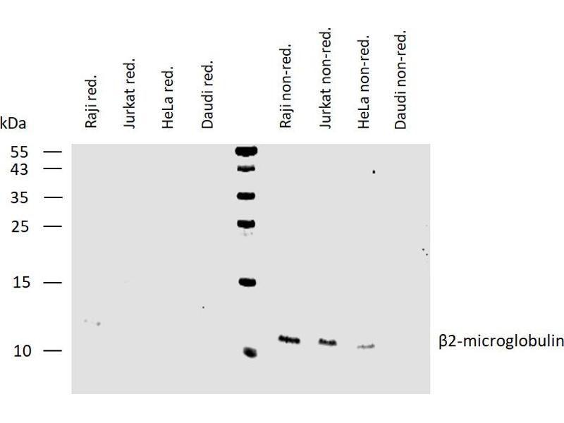 The mouse monoclonal antibody B2M-01 reacts with beta2-microglobulin (beta2M, extracellular antigen), associated with cell-surface MHC Class I molecules and other membrane antigens, as well as it reacts with soluble beta2-microglobulin. Beta2M is a 12 kDa Ig like glycoprotein expressed on lymphocytes, thymocytes, monocytes, granulocytes, platelets, endothelial cells and epithelial cells. It is absent on erythrocytes.