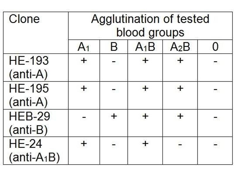 The antibody HEB-29 reacts with human blood group B. The specifity of the antibody HEB-29 was confirmed by comparison of specifity and reactivity to standard reagent using >5000 samples of blood.