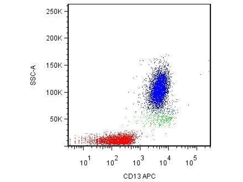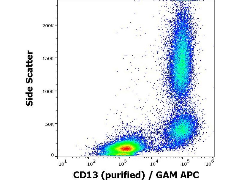 Alanyl aminopeptidase, membrane,CD13 (aminopeptidase N, APN) is a 150 kDa type II transmembrane zinc-binding ectopeptidase expressed on various cell types. This metalloprotease preferentially catalyzes removal of neutral amino acids from small peptides, thus activating or inactivating bioactive peptides. CD13 has also role in extracellular matrix degradation, antigen processing and signal transduction, is important in inflammatory responses, regulates intercellular contact, cell motility and vascularization. CD13 is involved in protection of leukemic cells against apoptosis and its expression associated with poor prognosis of carcinomas.,Aminopeptidase N, APN, PEPN, ANPEP, gp150, LAP1