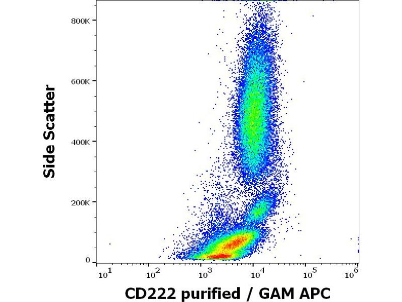 Insulin like growth factor 2 receptorprovided,CD222 (CIMPR, cation-independent mannose 6-phosphate receptor, IGF2 receptor) is a ubiquitously expressed 250 kDa transmembrane protein. No more than 10 % of CD222 is present on the cell surface where it serves as a multifunctional receptor. Intracellular (major) fraction of CD222 is involved in transport of newly synthesized lysosomal enzymes modified by mannose 6-phosphate from Golgi apparatus to lysosomes. The cell surface CD222 binds and internalizes exogeneous mannose 6-phosphate-containing ligands. Importantly, CD222 is crutial for internalization and degradation of insulin-like growth factor 2, thus controling cell growth. CD222 also complexes CD87 (urokinase-type plasminogen-activator receptor), plasminogen and latent TGF-beta, last but not least CD222 serves as a receptor for heparanase and even for Listeria.,IGF2R, MPR1, CIMPR, MPR300, M6P-R