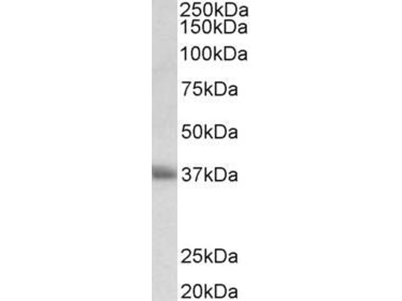 Western Blot: Approx 37 kDa band observed in Human Thymus lysates (calculated MW of 25.4 kDa according to NP_006128.1). We do note that CD7 is a glycoprotein which makes a higher size band to be expected. This molecular weight is routinely observed by othe