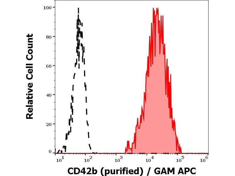 The antibody HIP1 reacts with an extracellular epitope of CD42b (GPIb alpha), a 135-145 kDa membrane glycoprotein expressed on platelets and megakaryocytes. CD42b and CD42c (GPIb beta) are composed in a disulfide linked heterodimer (CD42b/c, 160 kDa), CD42b/c forms a noncovalent complex with CD42a and CD42d.