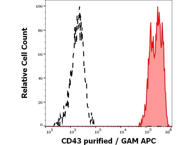 The antibody MEM-59 recognizes a neuraminidase-sensitive extracellular epitope on CD43 (Leukosialin), a 95-135 kDa type I transmembrane glycoprotein (mucin-type) which is involved in lymphocyte activation. CD43 is expressed by platelets and at high levels on the surface of all leukocytes, it is negative on resting B lymphocytes and erythrocytes.