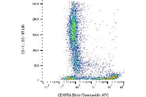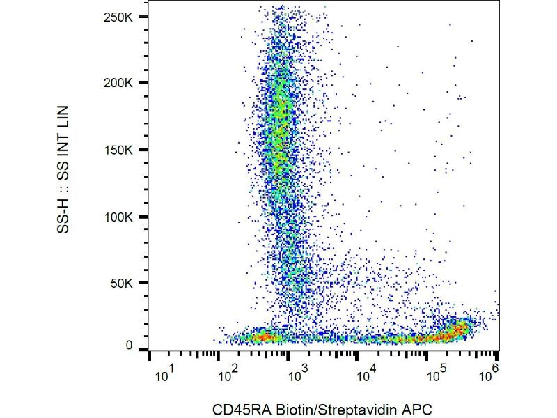 CD45RA is a high molecular weight isoform of a receptor-type protein tyrosine phosphatase, CD45 glycoprotein. CD45 is crucial in lymphocyte development and antigen signaling, serving as an important regulator of Src-family kinases, promotes cell survival by modulating integrin-mediated signal transduction pathway and is also involved in DNA fragmentation during apoptosis. CD45 isoforms differ in their extracellular domains, whereas they share identical transmembrane and cytoplasmic domains. These isoforms differ in their ability to translocate into the glycosphingolipid-enriched membrane domains and their expression depends on cell type and physiological state of the cell. CD45RA is expressed e.g. on naïve T cells and normal plasma cells.,PTPRCR, T200RA