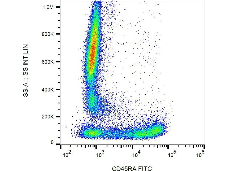 CD45RA is a high molecular weight isoform of a receptor-type protein tyrosine phosphatase, CD45 glycoprotein. CD45 is crucial in lymphocyte development and antigen signaling, serving as an important regulator of Src-family kinases, promotes cell survival by modulating integrin-mediated signal transduction pathway and is also involved in DNA fragmentation during apoptosis. CD45 isoforms differ in their extracellular domains, whereas they share identical transmembrane and cytoplasmic domains. These isoforms differ in their ability to translocate into the glycosphingolipid-enriched membrane domains and their expression depends on cell type and physiological state of the cell. CD45RA is expressed e.g. on naïve T cells and normal plasma cells.,PTPRCR, T200RA