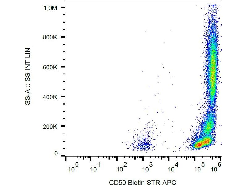 Intercellular adhesion molecule 3,CD50 (intracellular adhesion molecule 3, ICAM-3) is a transmembrane glycoprotein expressed by leukocytes, that serves as a counter-receptor for the lymphocyte function-associated antigen (LFA)-1 integrin. Besides functioning as an adhesive molecule that mediates e.g. the contact between T cells and antigen presenting cells, ICAM-3 regulates affinity of LFA-1 for ICAM-1 and induces T cell activation and proliferation. ICAM-3 plays an essential role in the initiation of the immune response both on T cells and antigen presenting cells and interacts also with CD209 (dendritic cell-specific ICAM-3-grabbing nonintegrin, DC-SIGN), a C-type lectin of dendritic cells and macrophages, this process is involved in dialogue between dendritic cells and granulocytes.,ICAM-3, ICAM-R