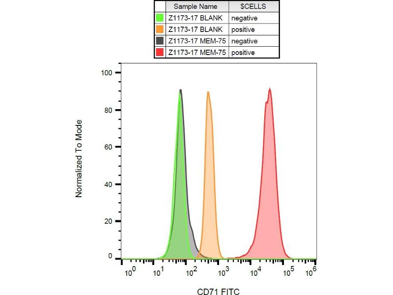 The antibody MEM-75 reacts with an extracellular epitope of CD71 antigen (transferrin receptor), a 95 kDa type II homodimeric transmembrane glycoprotein expressed on activated B and T lymphocytes, macrophages and erythroid precursors, it is lost on resting blood leukocytes. The antibody MEM-75 does not block binding of transferrin to the receptor.