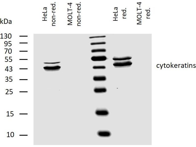 The antibody C-11 reacts with cytokeratin peptides 4, 5, 6, 8, 10, 13, 18. Cytokeratins are members of intermediate filaments subfamily intracellular proteins represented in epithelial tissues.