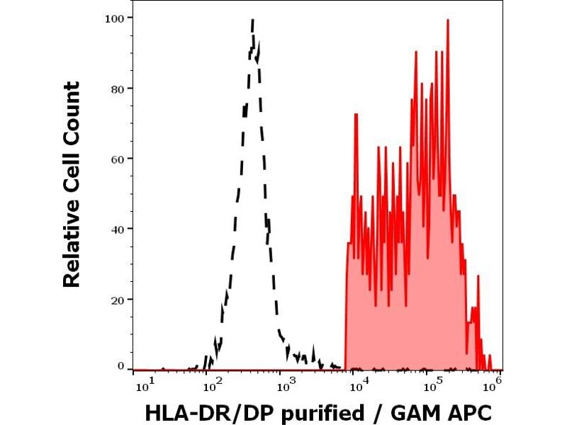 The antibody MEM-136 recognizes a common extracellular epitope on beta-chain of human HLA-DR and HLA-DP. It reacts with alpha/beta dimer as well as with dissociated beta-subunit. DR and DP are the isotypes of human MHC Class II molecules expressed on antigen-presenting cells (APC, dendritic cells, B lymphocytes, monocytes, macrophages).