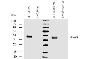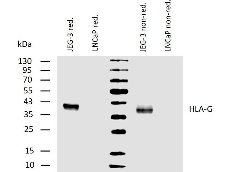 The antibody MEM-G/1 reacts with an extracellular epitope of denaturated HLA-G heavy chain. HLA-G belongs to the MHC Class I molecules (MHC Class Ib, nonclassical) and it is expressed on the surface of trophoblast cells.