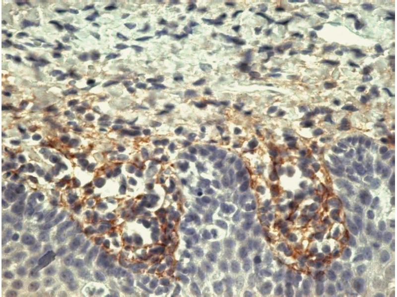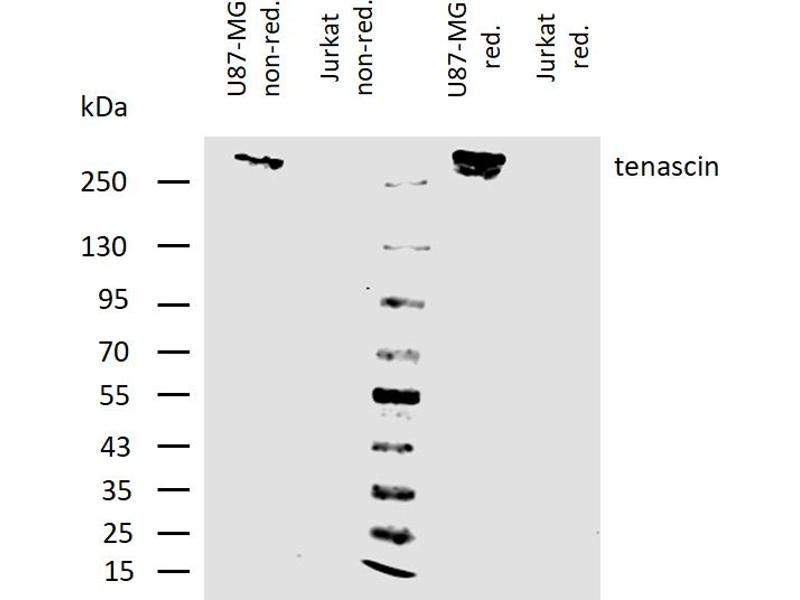 Immunohistochemistry (paraffin sections): Immunohistochemical detection of tenascin is valuable for studies of tissue differentiation and tumour growth. The antibody T2H5 is excellent for staining of paraffin-embedded tissue sections. Heat-mediated antigen retrieval in citrate buffer. Western blotting: Recommended dilution: 1-2 μg/mL.