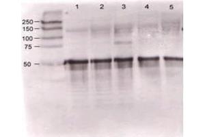 Application Note: Anti-Antiopoietin-1 Antiserum has been tested in ELISA, western blot, immunohistochemistry, and immunofluorescence and is suitable for other antibody based assays. A 1:500 dilution is recommended for western blotting. The reaction of this antiserum directly with cell supernatants may result in high background due to reactivity of components in the serum. This can be alleviated by first immunoprecipitating the antibody:antigen complex and then detecting the antigen. This method results in a very clean and strong signal. Both Ang-1 and Ang-2 proteins have predicted molecular weights of approximately 57 kDa and appear on western blots close to their predicted molecular weights. In some instances additional bands may be seen at approximately 75 kDa which represent highly glycosylated forms of the protein that migrate at a higher apparent molecular weight.