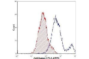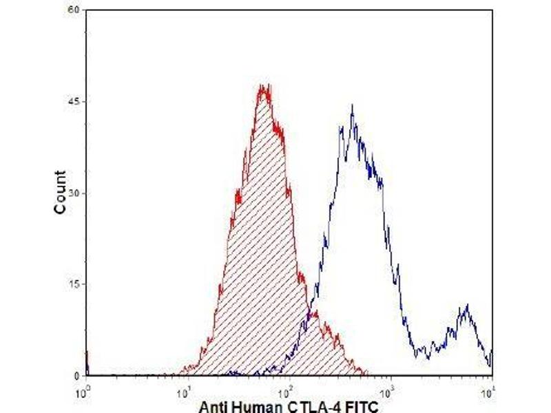 Human CTLA-4 (also known as Cytotoxic T lymphocyte-associated antigen-4, CD152) is a structural homologue of T cell co-stimulatory receptor CD28. CTLA-4 binds to the same ligands (CD80 and CD86) as CD28 but with much higher avidity. It is expressed at very low levels on the cell surface of activated T cells, and is found primarily in the post-Golgi or endosomal compartments of the cell. There is a high degree of overall homology between human and mouse CTLA-4 (>70 % ), and the cytoplasmic domains of the human, mouse and rabbit sequences are completely conserved. CD152 antibodies have shown both stimulatory and negative regulatory roles in functional experiments.Synonyms: CTLA-4, Cytotoxic T-lymphocyte protein 4, Cytotoxic T-lymphocyte-associated antigen 4