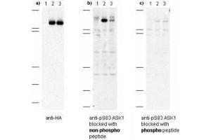 Application Note: This phospho specific polyclonal antibody reacts human pS83 ASK1 and shows minimal reactivity by western blot, ELISA and competitive ELISA with non-phosphorylated ASK1. Although not tested, this antibody is likely functional in RIA, immunohistochemistry and immunoprecipitation. For immunoblotting a 1:1,000 dilution is recommended. A 155 kDa band corresponding to human ASK-1 is detected. Whole cell lysates from SW1353 can be used as a positive control. For ELISA a 1:5,000 to 1:10,000 dilution is recommended. Researchers should determine optimal titers for other applications.