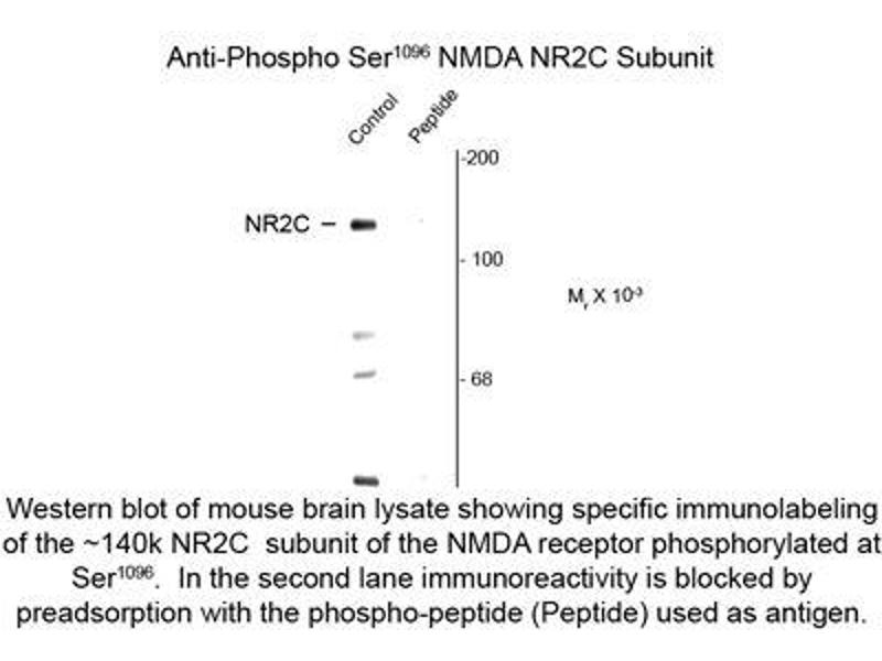 - Specific for the ~140k NR2C subunit of the NMDA receptor phosphorylated at Ser1096. Immunolabeling is blocked by preadsorption of antibody with the phospho-peptide that was used to generate the antibody but not by the corresponding dephospho-peptide.
