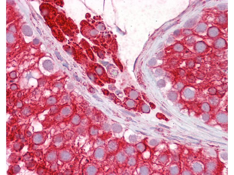 A synthetic sequence corresponding to amino acids 14-30 (DSPPRPQPAFKYQFVRE) of human Nogo-B was used as the immunogen, GenBank no. AAG40878.1|AF320999_1. Percent identity by BLAST analysis: Human, Gibbon, Monkey, Marmoset, Pig (100%), Bovine (94%), Mouse, Rat, Bat, Dog (88%), Opossum (82%).
