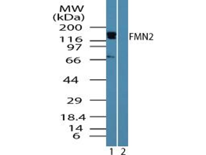 A synthetic peptide (SDAVQKEVVDMKSEGQATC) corresponding to amino acids 657-674 of human FMN2, GenBank no NP_064450.3. Percent identity by BLAST analysis: Human, Chimpanzee, Gorilla, Orangutan (100%), Gibbon (94%), Monkey (89%), Ferret, Bovine, Horse (83%), Mouse, Rat (72%).