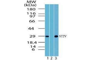 A synthetic peptide corresponding to amino acids 207-220 (QSFCKLKKSLIFSN) of human ST2V, GenBank no BAA85894. Percent identity with other species by BLAST analysis: Human (100%).