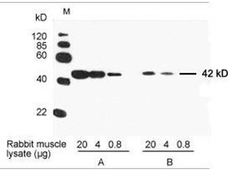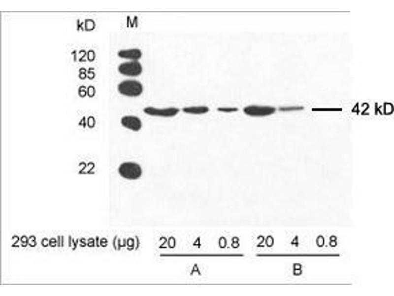 The beta Actin antibody ABIN962807 reveals a protein of the expected molecular weight of beta actin in lysates of human HEK293 cells.