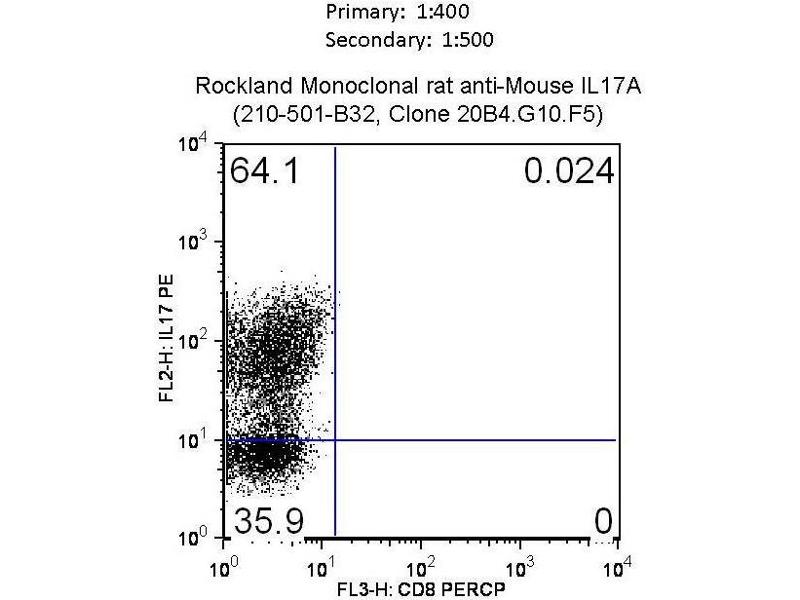 Application Note: IL-17 A antibody has been tested for use in western blotting, Flow Cytometry and ELISA. Specific conditions for reactivity should be optimized by the end user. Expect a band approximately 23 kDa in size corresponding to the mature mouse IL-17A protein, a non-glycosylated polypeptide chain consisting of 207 amino acids, by western blotting in appropriate cell lysate or extract.