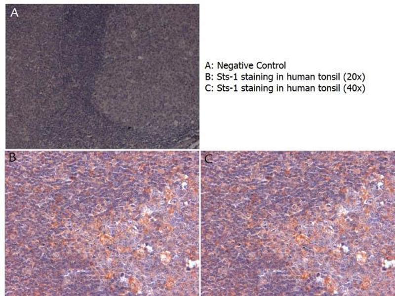 Immunogen: This affinity purified antibody was prepared from whole rabbit serum produced by repeated immunizations with a synthetic peptide corresponding to the C-terminus of mouse Sts-1.