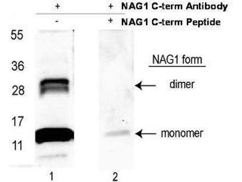 Application Note: This affinity purified NAG1/GDF15 antibody has been tested by ELISA, IHC, and western blotting of human and mouse NAG-1 protein. For detection of NAG-1 in human serum, a sandwich ELISA is suggested using this antibody in combination with anti-NAG1/GDF15 (N-terminal), H variant or D variant specific antibodies. Specific conditions for reactivity should be optimized by the end user. Expect bands in Western blots of approximately 14 and 28 kDa in size corresponding to NAG-1 monomer and dimer, respectively, using the appropriate cell lysate or extract.