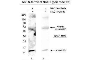 Application Note: This affinity purified anti-NAG1/GDF15 antibody is tested for ELISA and western blotting of human NAG-1 protein. For detection of NAG-1 in human serum, a sandwich ELISA is suggested using this antibody in combination with anti-NAG-1/GDF15 C-terminal specific antibodies. This antibody is useful in dual antibody immunometric assays (EIA). Specific conditions for reactivity should be optimized by the end user. Expect bands in western blots of approximately 14 kDa in size corresponding to NAG-1 monomer using the appropriate cell lysate or extract.