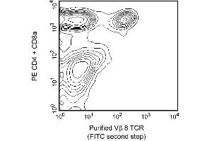 The F23.1 antibody reacts with the Vbeta 8.1, Vbeta 8.2, and Vbeta 8.3 T-cell receptors (TCR) of mice having the b haplotype (e.g., A, AKR, BALB/c, CBA/Ca, CBA/J, C3H/He, C57BL, C58, DBA/1, DBA/2) of the Tcrb gene complex. The Tcrb-V8 subfamily gene loci are deleted in mice having the a (e.g., C57BR, C57L, SJL, SWR) or c (e.g., RIII) haplotype. Vbeta 8.1 TCR-bearing T lymphocytes are clonally eliminated in mice expressing superantigen coded by Mtv-7 (Mls-1a, Mlsa) provirus (e.g., AKR, CBA/J, C58, DBA/2), and activation or elimination of Vbeta 8.1 TCR-expressing T cells by this determinant is partially dependent upon presentation by I-E. Mtv-43 and/or exogenous MMTV-SW superantigens also cause incomplete elimination of Vbeta 8.1 TCR-bearing T cells. In addition to expression on conventional T lymphocytes, Vbeta 8.2 is the predominant beta chain of the TCR on NK-T cells. Staphylococcal enterotoxin B, in association with antigen-presenting cells expressing I-A and/or I-E, stimulates lymphocytes bearing Vbeta 8 TCR and selectively eliminates those T cells in vivo. Soluble and plate-bound F23.1 antibody activates Vbeta 8 TCR-bearing T cells, soluble antibody blocks cytolysis mediated by Vbeta 8 TCR-bearing cytotoxic T lymphocytes, and in vivo treatment of neonatal mice can arrest intrathymic maturation of Vbeta 8 TCR-bearing T cells. This antibody is routinely tested by flow cytometric analysis.