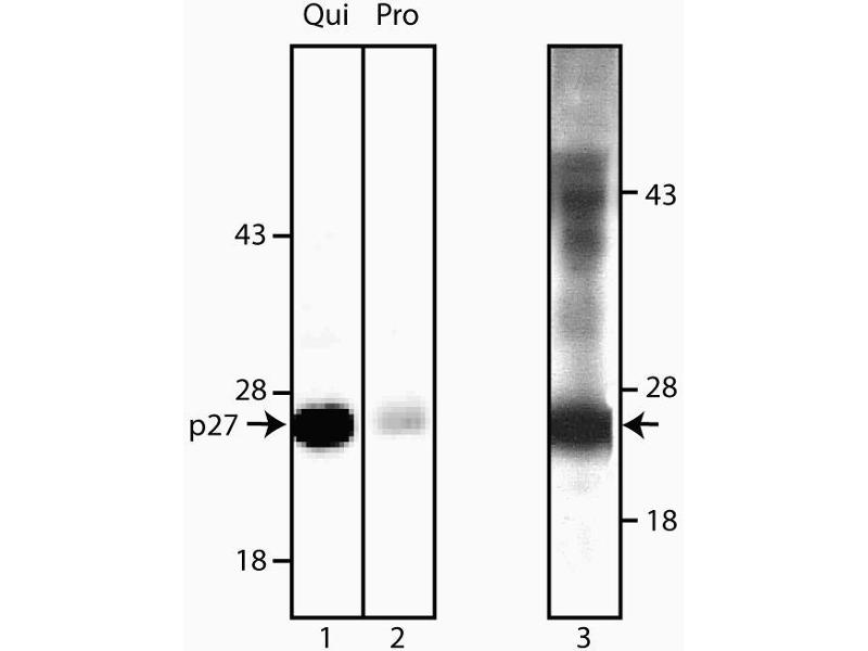 - Cyclins and cyclin-dependent kinases (cdks) are evolutionarily conserved proteins that are essential for cell-cycle control in eukaryotes. Cyclins (regulatory subunits) bind to cdks (catalytic subunits) to form complexes that regulate the progression of the cell cycle. These complexes are regulated by activating and inhibitory phosphorylation events, as well as by interactions with small proteins that bind to cyclins, cdks, or cyclin-cdk complexes. These include p15, p16, p18, p19, p21 and p27 [Kip1]. p27 [Kip1] has been shown to inhibit the activity of multiple cyclin-cdk complexes, including cyclin D-cdk4, cyclin E-cdk2 and cyclin A-cdk2. p27 [Kip1] is a 27 kD protein which shares N-terminal sequence homology with p21, and like p21, p27 [Kip1] contains a nuclear localization signal in its C-terminal region. IL-2 activation of T cells has been reported to lead to a decrease in p27 [Kip1] and entry into S phase. Removal of IL-2 from T cell cultures results in increased levels of p27 [Kip1] and cell quiescence.