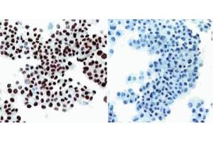 Simian virus 40 (SV40) is a small DNA virus encoded by 5.2 kb of double-stranded DNA. SV40 large T-antigen (T-ag) is a multifunctional ~85 kDa phosphoprotein, which is the sole viral protein required for SV40 replication. All other factors are provided by the infected host cell. In addition to its role in SV40 DNA replication, T-ag also causes transformation of susceptible cell lines. Studies of various mutant T-ag proteins have shown that the replication and transformation fractions of T-ag can be separated. The multifunctional nature of this protein has resulted in its use as a model system in a wide variety of disciplines. T-ag exercises negative regulation on the transcription of SV40 early mRNA by feedback inhibition and exerts positive regulation on transcription from the late promoter. In addition to transcriptional regulation, T-ag is involved in viral DNA replication. Specific biochemical functions required for DNA synthesis that are inherent to the T-ag include high-affinity binding to sites within the viral origin of DNA synthesis, ATPase, and helicase activities. Other functions attributed to T-ag include cellular transformation, induction of cellular DNA synthesis, induction of rRNA synthesis, and provision of a host-range function for viral replication. However, functions of T-ag are influenced by a wide range of post-translational modifications including phosphorylation, glycosylation, acetylation, acylation, and adenylation. T-ag exists in monomeric as well as polymeric forms, and associates with the tumor suppressor proteins p53 and retinoblastoma protein (Rb). Most of T-ag is transported to the nucleus, while a small fraction is localized at the cell surface. Small t-Ag is a polypeptide which shares 82 N-terminal amino acids with large T antigen and has a unique C-terminal region. Clone PAb 108 recognizes an N-terminal epitope within the first 82 amino acids of T-ag and small t antigen (t-ag). B4 SV40-transformed BALB/c mouse fibroblasts were used as immunogen. PAb 108 was originally produced and characterized as part of a panel of antibodies designated PAb 102-117.