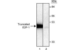 The transcription factor E2F was originally characterized as a sequence-specific DNA-binding factor bound to the adenovirus E2A promoter. E2F-binding sites have now been identified in cellular promoters for genes involved in growth regulation, including c-myc, N-myc, Cdc2 and cyclin A. They have also been identified in promoters for genes whose products are required for DNA synthesis and replication, such as DNA polymerase a, thymidine kinase, thymidylate synthase, and dihydrofolate reductase. When bound to DNA, E2F has been found in complexes with key regulators of cell proliferation including the retinoblastoma protein (Rb) and the Rb related proteins, p107 and p130. Like a variety of other transcription factors, E2F binds to DNA as a heterodimer. The protein E2F-1 has E2F-like properties, it mediates E2F-dependent trans-activation and binds to underphosphorylated Rb. E2F dimerizes with DP-1, a protein which also has E2F-like properties. This dimerization leads to increased DNA binding activity and enhanced transcriptional activity. It is thought that E2F-1/DP association forms an active E2F” transcription factor. E2F-1 migrates at a reduced molecular weight of ~60 kDa. Clone KH95/E2F (also referred to as KH95) recognizes an epitope between amino acids 342 and 386 of human E2F-1. It cross reacts with mouse and rat E2F-1. Full length, bacterially expressed, recombinant histidine-tagged human E2F-1 (amino acids 1-437) was purified and used as immunogen. Positive tissue culture supernatants were identified by immunoprecipitation of [35S]methionine-labeled, in vitro synthesized E2F-1 protein.