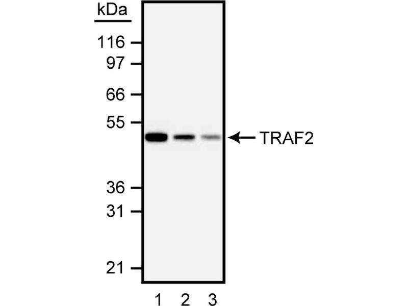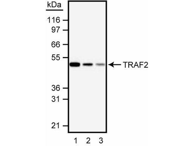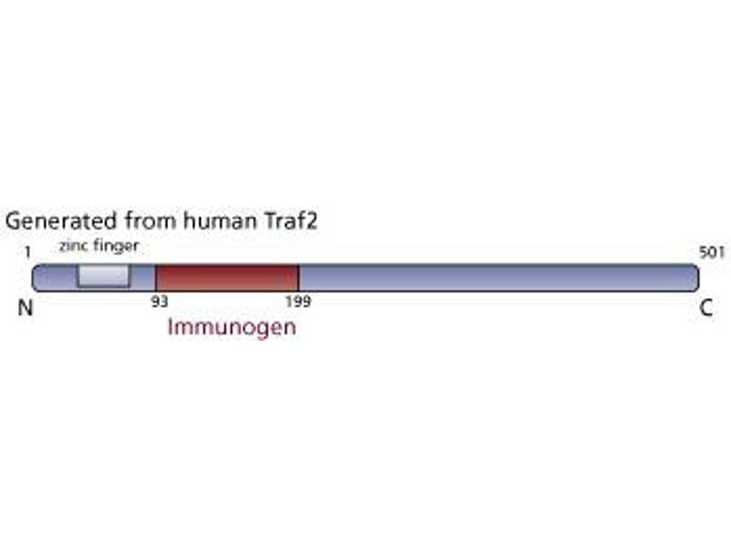- TRAFs (TNF receptor associated factors) are signal transducing molecules which participate in forming TNF/Nerve Growth Factor receptor-associated signalling complexes. TRAF proteins share a novel C-terminal homology region, the TRAF” domain, a coiled-coiled region and the majority have Zinc/RING finger motifs. At least six TRAF proteins (TRAFs 1-6) have been identified. These proteins are cytoplasmic adapters, they bind to cytoplasmic domains of various receptors and can function to recruit other proteins to a signaling complex thereby promoting intracellular signal transduction. Specifically, TRAF2 has been shown to interact with the following surface receptors: TNFRII, CD27, CD30, CD40, 4-1BB, Ox40, HVEM/ATAR and LMP-1. TRAF2 has also been shown to associate with intracellular proteins, including TRADD, FADD, I-TRAF/TANK, TRIP, A20, c-IAP1 and 2, Casper, RIP and NIK. Thus, the interaction of TRAF2 with these various receptors and intracellular proteins plays an important role modulating downstream events which can result in inducing cell death or keeping cells alive. For example, cells deficient in TRAF2 demonstrated increased sensitivity to TNF-induced cell death, but a decrease in TNF-induced JNK activation, and little change on NF-kB activation. TRAF2 is detected at ~ 53 kDa in western blot analysis. The C90-481 antibody reacts with human TRAF2. A synthetic protein freagment corresponding to amino acids 93-199 of human TRAF2 was used as immunogen.