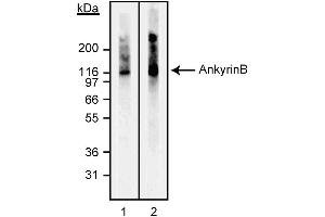 - Ankyrins are a family of proteins which were first discovered in erythrocytes and shown to bind to spectrin, a primary component of the cytoskeletal architecture. They have since been shown to be expressed at very high levels in the vertebrate brain and are also found in other cell types. Ankyrins function by acting as adaptors to link integral membrane proteins, including cell adhesion and ion channel molecules to the cytoskeleton. The structure of ankyrin consists of three domains, two highly conserved N-terminal and one C-terminal variable domain. The conserved regions contain a membrane-binding domain of ~89-95 kDa and a spectrin-binding domain of ~62 kDa, while the variable region has pre-mRNA alternative splice sites. Two ankyrins have been extensively characterized: ankryin R is the product of the ANK1 gene and is primarily expressed in the brain, although alternatively spliced forms are found in erythrocytes, ankyrin B is the product of the ANK2 gene, located on a different chromosome from ANK1, and is primarly expressed in neonatal and adult brain but is also found in heart, lymphocytes and platelets. Studies done on ankyrinB (-/-) knockout mice, which die by postnatal day 21, have demonstrated a link between the L1 cell adhesion molecule and ankyrin B in premyelinated axons. Isoforms of ankyrin B have been reported to be detectable ranging from approximately 440, 220, 150 and 110 kDa in western blot analysis, depending on the tissue-type of origin. This antibody is routinely tested by western blot analysis.