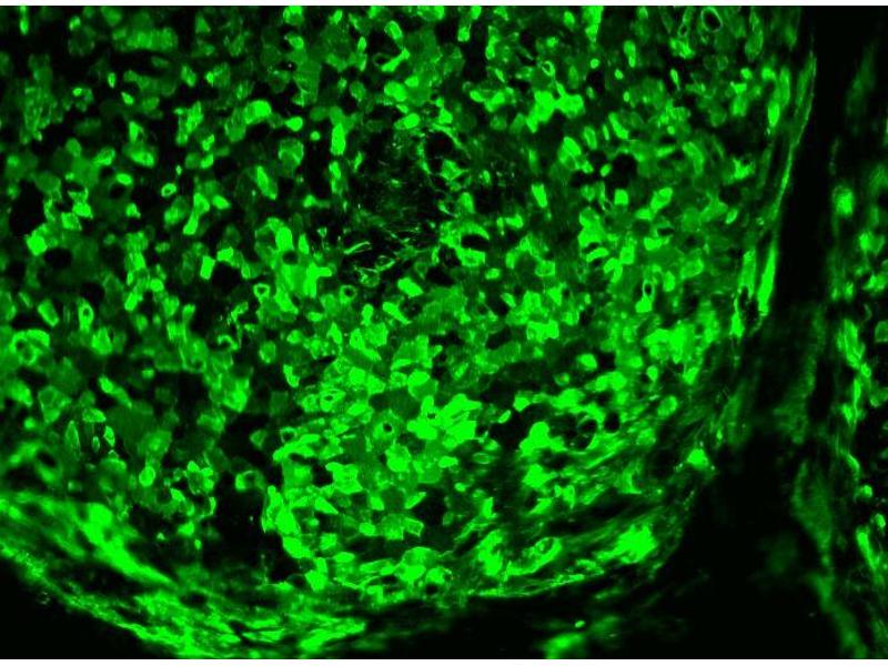The TRA-1-60 monoclonal antibody reacts with the neuraminidase-resistant form of a pluripotent-stem-cell-specific epitope on a high-molecular-weight transmembrane glycoprotein. The TRA-1-60 antigen is a sialylated epitope on the same keratan sulfate core molecule, podocalyxin, as 4 other distinct antigens on tumor-derived cell lines, TRA-1-81, GCTM2, K4, and K21. The expression of TRA-1-60 antigen is stage-specific and can be used to characterize embryonic cells and monitor their differentiation. The antigen is found on teratocarcinoma (embryonal carcinoma or EC), embryonic inner cell mass (but not morula or trophoblast), and embryonic stem (ES) cells. TRA-1-60 antigen is released into the serum of patients bearing testicular tumors containing EC cells. As human EC and ES cells undergo differentiation, expression of TRA-1-60 antigen is lost. Expression of TRA-1-60 antigen has also been observed on a rhesus monkey ES cell line (Thomson et al, 1995).