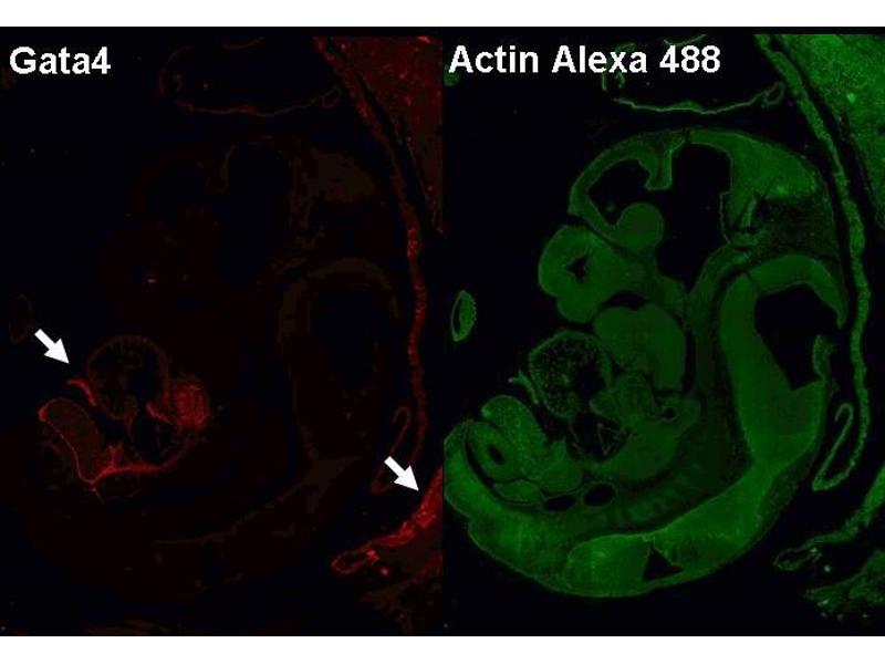 The L97-56 monoclonal antibody reacts with GATA4 (GATA-binding protein 4), a member of the GATA family of zinc finger-containing transcription factors that bind to the GATA nucleotide sequence. This ~50-kDa (observed MW) nuclear protein is expressed in mesodermal and definitive endodermal tissues such as the gastrointestinal tract, gonads, and heart. Genetic studies suggest that GATA4 regulates embryonic cardiac development: in mice, disruption of the GATA4 gene leads to defects in heart tube formation, while mutations of GATA4 are associated with atrial septal defects in humans. In the adult heart, GATA4 regulates differentiated gene expression. The roles of GATA4 in endocrine and reproductive functions were recently reviewed. Synonyms: MGC126629, GATA-4
