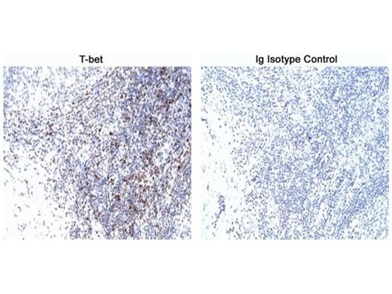 The O4-46 monoclonal antibody specifically binds to human and mouse T-bet. T-bet (T-box gene expressed in T cells) is a master regulatory transcription factor that is also known as TBX21 (T-box21) and TBLYM (T-box transcription factor, expressed in lymphocytes). Human (535 amino acids, 58.3 kDa predicted molecular mass) and mouse (530 amino acids, 57.7 kDa) T-bet proteins are encoded by the human TBX21 (chromosome 17) and mouse Tbx21 (chromosome 11) genes. The human and mouse T-bet protein amino acid sequences are 88% homologous. Human and mouse T-bet proteins share a highly conserved (98% homologous amino acid sequences) T-box protein domain that is centrally located and mediates binding to DNA. T-bet is expressed by and activates transcriptional activities within hemotopoietic cells including stem cells, NK and NKT cells and subsets of thymocytes, primed/activated CD4+ T cells, CD8+ T cells and gammadelta T cells, B cells, and dendritic cells. Interferon-gamma (IFN-gamma), interleukin-27 (IL-27), and IL-12 act on peripheral antigen-triggered (TCR-signaling) T cells to increase T-bet expression. With respect to T helper lymphocytes, T-bet directs the differentiation of naïve CD4+ precursor T cells to become Th1-like effector and memory cells. T-bet accomplishes this by activating Th1 genetic programs (including epigenetic modifications) while repressing opposing T helper subset programs. T-bet controls the upregulated expression of the Th1 signature cytokine, IFN-gamma, the IL-12Rbeta2 subunit and the Runx3 transcription factor and can repress the function of other transcriptional regulators, such as GATA-3 (master regulator of Th2 development) and the expression of other cytokines including IL-2, IL-4 and IL-5.