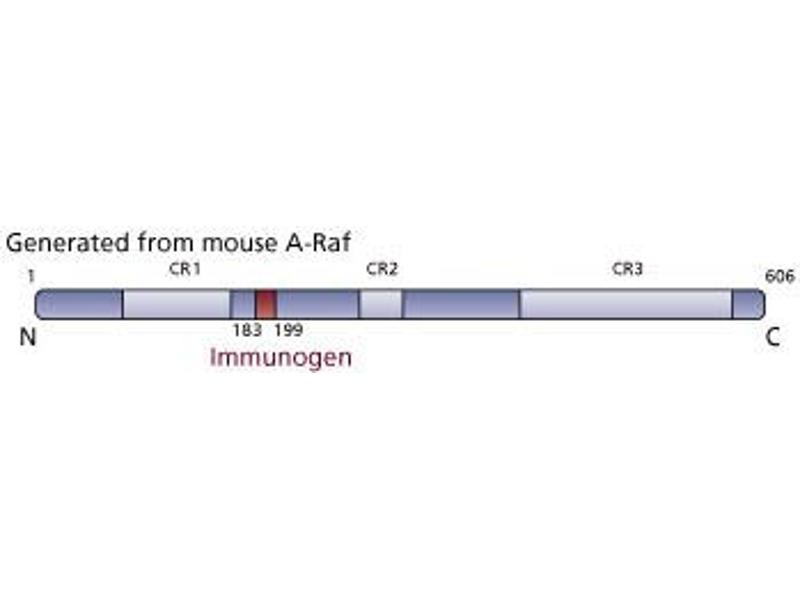 - A-Raf, a proto-oncogene that encodes a 68 kDa serine/threonine-specific protein kinase, shows strong homology to c-Raf and v-Raf in the kinase region of the molecule. c-Raf appears to be uniformly and ubiquitously expressed, but A-Raf expression is much more variable. A-Raf is found at highest levels in urogenital and kidney tissues, with the lowest levels found in brain. Cell transformation by A-Raf has been shown to be independent of p21[ras], suggesting the possibility of an independent signal transduction pathway. This antibody is routinely tested by western blot analysis.