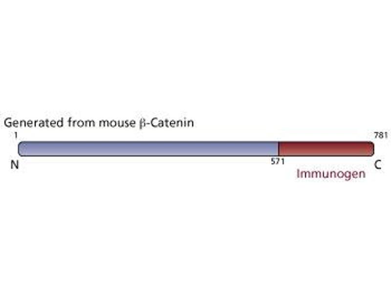Beta-Catenin is a 92 kDa protein that binds to the cytoplasmic tail of E-Cadherin. The cadherins, transmembrane adhesion molecules, are found with catenins at adherens junctions (zonula adherens). Deletions in the cytoplasmic domain of E-Cadherin which eliminate catenin binding also result in a loss of cell adhesion, indicating that this binding is essential for E-Cadherin function. Although the alpha- and beta-Catenins have been cloned, very little is known about their biochemical roles. However a link between beta-Catenin and colon cancer has been described. beta-Catenin was found to co-immunoprecipitate with the APC tumor suppressor protein in human colorectal tumor cell lines, as well as in human kidney 293 cells. E-Cadherin, however, was not detectable in these complexes. Thus the APC-Catenin complex may be affecting the transmission of contact inhibition signals and/or the regulation of cell adhesion.