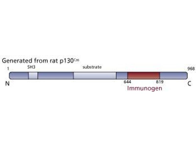 P47 [v-crk] is the product of a transforming gene, v-crk, that was isolated from avian sarcoma viruses. The v-crk protein is a fusion product of the viral gag protein and a part of cellular crk that includes SH2 and SH3 domains. v-crk induced transformation increases tyrosine phosphorylation of several cellular proteins, including p130 [Cas]. p130 [Cas] is tightly associated with v-crk via the SH2 domain of v-crk. Tyrosine phosphorylation of p130 [Cas] occurs in conjunction with cellular transformation in cells that express v-src or v-crk. This phosphorylation leads to a change in p130 [Cas] localization from the cytoplasm to the cell membrane and, possibly, to the nucleus. Since p130 [Cas] also associates with v-src, it may be a v-src substrate. This antibody is routinely tested by western blot analysis.