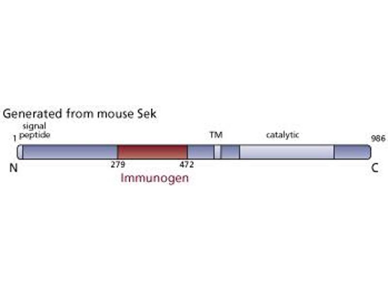- EphA4/Sek is a glycosylated protein tyrosine kinase of 986 amino acids and an apparent 110-130kDa molecular weight (molecular weight depends on glycocylation level of protein). EphA4 belongs to the Eph subfamily of receptor tyrosine kinases and like many others, it has an amino-terminal ligand-binding domain exposed to the extracellar matrix. EphA4 is predominantly expressed during development (this is common in the Eph family) and because of its mRNA localization, it has been proposed that it may play a role during segmentation of the hindbrain and mesoderm. Tyrosine 602 is a major autophosphorylation site of EphA4 and appears to be the docking site for the intracellular tyrosine kinase fyn.