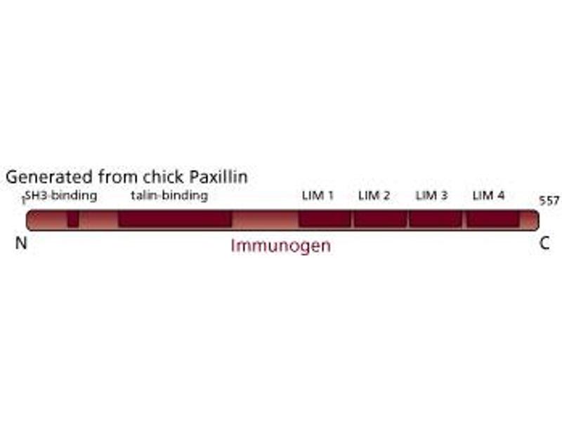 - Paxillin, a focal adhesion protein, is a substrate for several tyrosine kinases such as src, FAK, and p120BRC/ABL. The tyrosine phosphorylation of paxillin is affected by conditions that change cell-cell adhesion. This is consisent with the possibility that paxillin is involved in the regulation of cell morphology. Additionally, because of its SH3 binding domain, paxillin associates tightly with FAK and Crk in an extracellular matrix-independent manner. Paxillin was initially detected in fibroblasts, and its phosphorylation may be important during neurite extension during differentiation. This antibody is routinely tested by western blot analysis.