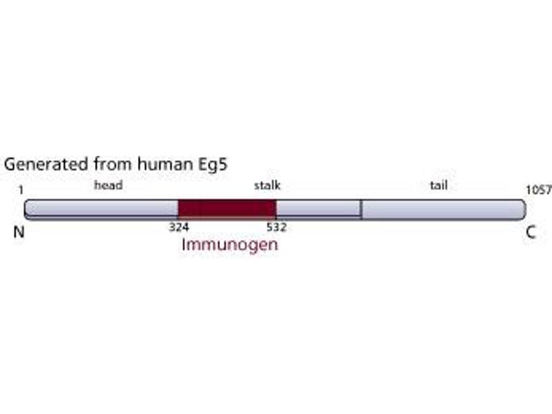 - The mitotic spindle apparatus equally distributes duplicated chromosomes to daughter cells. This process is mediated by the dynamic instability of the spindle microtubules and the forces generated by the action of cytoplasmic dynein and kinesin-related motor proteins (KRPs), such as CHO1/MKLP1. These motors hydrolyze ATP as they move progressively along the microtubules. They organize the microtubules into bipolar spindles and may also serve as bridges between microtubules and chromosome kinetochores or centrosomes. Eg5, identified in Xenopus laevis, is a plus-end directed KRP, associated with the mitotic spindle. Vertebrate Eg5 is a member of the KRP subfamily bimC. These family members share a high degree of sequence homology (>80% within the N-terminal motor domain) and may execute similiar functions. During mitosis, Eg5 is specifically phosphorylated at Thr-297, an evolutionarily conserved cdc2 phosphorylation site, by p34[cdc2]/cyclin B. Inhibition of phosphorylation blocks the interaction of Eg5 with centrosomes. Thus, Eg5 is a mitotic motor protein that regulates spindle formation in a phosphorylation-dependent manner. This antibody is routinely tested by western blot analysis.