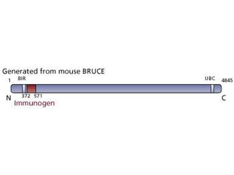 Selective proteolysis is essential for the modulation of key cellular processes such as cell cycle progression. However, unlike other post-translational events, proteolysis is irreversible and therefore must occur in unidirectional cellular pathways. In eukaryotes, proteolysis is mediated primarily by the ubiquitin pathway. This pathway designates proteins for degradation by the proteasome, a multicatalytic protease complex. The ubiquitin pathway is a multistep system that tags proteins for degradation via the attachment of ubiquitin molecules to the target. This attachment is mediated by the ubiquitin activating/conjugating enzymes E1, E2, E3, and BRUCE. BRUCE (BIR Repeat containing Ubiquitin-Conjugating Enzyme) is a novel enzyme that associates with the Golgi and the vesicular system. It contains a UBC (ubiquitin conjugating enzyme) domain, which is essential for catalysis, and a BIR (baculovirus inhibitor of apoptosis repeat) motif. BIR motifs are also found within inhibitor of apoptosis proteins (IAP) and are critical for anti-apoptotic activity. Therefore, BRUCE may function to both mediate ubiquitin-dependent proteolysis and contribute to anti-apoptotic cellular pathways.