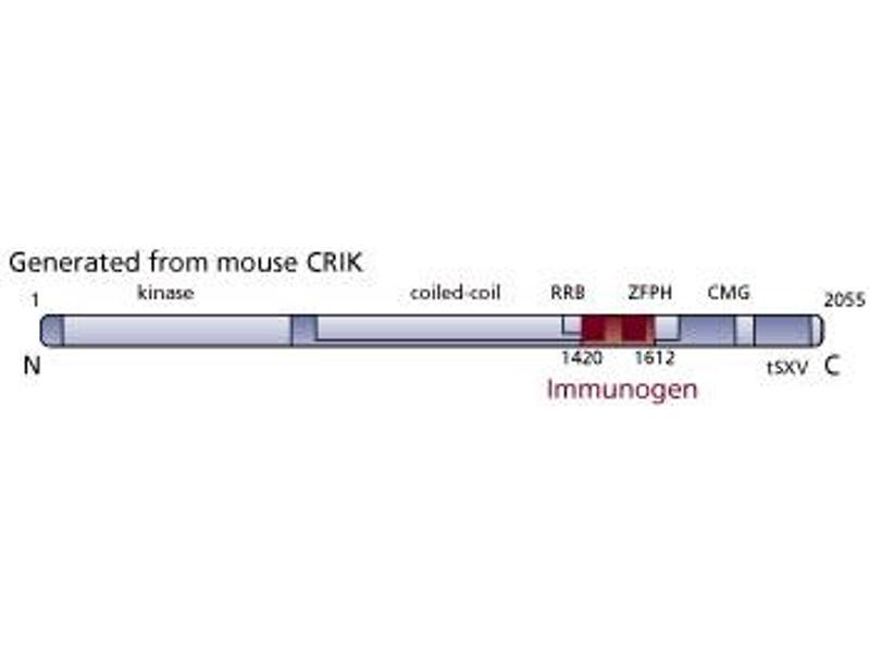 Citron was identified by its interactions with activated Rho and Rac. It contains a zinc finger (ZF) region, a pleckstrin homology (PH) domain, a citron/MRCK/Gek (CMG) domain, and a coiled-coil domain with a Rho-Rac binding region (RRB). Citron binds to PSD-95 via its C-terminal tSXV motif and the PDZ domain on PSD-95. This association occurs at post synaptic densities where citron-PSD-95 may provide a specific link between the Rho signaling cascade and the synaptic NMDA receptor complex. Citron Rho-interacting kinase (CRIK) and CRIK short kinase (CRIK-SK) are Ser/Thr kinase isoforms of the myotonic dystrophy kinase family. CRIK contains full-length citron, with an N-terminal kinase domain. CRIK-SK is a splice variant that contains only the kinase domain. CRIK co-localizes with actin in keratinocytes and co-expression of CRIK and Rho increases CRIK kinase activity two-fold. In addition, CRIK mutants cause abnormal contraction during cytokinesis. CRIK is expressed highest in testis, but is also present in brain, spleen, lung, and kidney. Thus, CRIK is a Ser/Thr kinase that functions downstream of Rho during events such as cytokinesis and synaptic transmission.