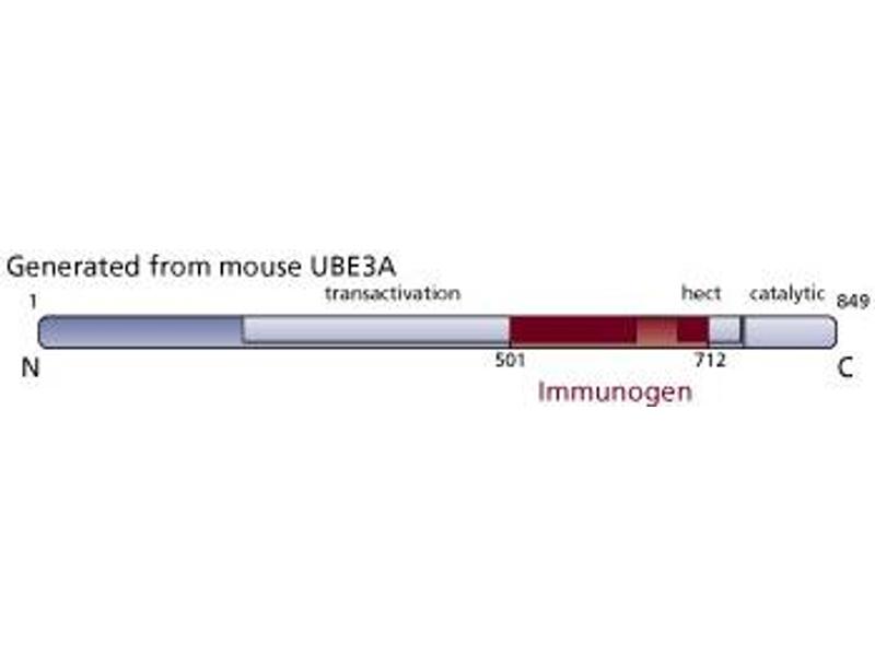 Protein ubiquitination is the end product of a multienzyme cascade that involves sequential thiol-ester bond interactions between ubiquitin and enzymes termed E1 ubiquitin-activating enzymes, E2 ubiquitin-conjugating enzymes, and E3 ubiquitin protein ligases. UBE3A (human papilloma virus E6-associated protein, E6-AP) is an E3 ubiquitin protein ligase that is linked to the neurological disorder Angelman syndrome. It mediates the interaction of human papilloma virus types 16 and 18 E6 proteins with p53, which targets p53 to the ubiquitination-proteasome degradation pathway. The C-terminal region of UBE3A contains a hect domain, which is found in many E3 ubiquitin protein ligases, while the central region contains an E6 binding region. UBE3A is expressed in the cytoplasm and nucleus of many tissues. The interaction of UBE3A with the progesterone receptor coactivates transciptional activity of the receptor in the presence of bound hormone. Thus, UBE3A is an essential component of the ubiquitination degradation pathway and the nuclear hormone receptor signal transduction pathways. This antibody is routinely tested by western blot analysis.