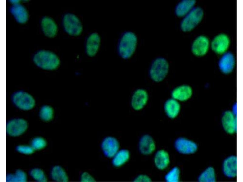 P52/p75 proteins were first identified through their interaction with transcriptional factors and splicing factors. p75 is encoded by exons 1-15 and contains 530 amino acids, while the alternatively spliced p52 is encoded by exons 1-9 and contains 333 amino acids. Both p52 and p75 have strong interactions with the VP16 activation domain and with various components of the general transcriptional machinery. p52 is the more active transcription activator and has also been shown to recruit the pre-mRNA splicing factor ASF/SF to sites of active transcription. Interestingly, p52/p75 has also been identified as Lens Epithelium-Derived Growth Factor (LEDGF). In serum free media, LEDGF stimulates the growth and survival of a variety of cells, such as lens epithelial cells, retinal photoreceptor cells, COS7 cells, skin fibroblasts, and keratinocytes. In retinal photoreceptor cells, LEDGF is found in the nucleus where it promotes resistance to serum starvation and thermal stress. Thus, the LEDGF gene encodes splice variants that may regulate gene transcription and mRNA splicing of a variety of proteins that are essential for cell growth and survival.